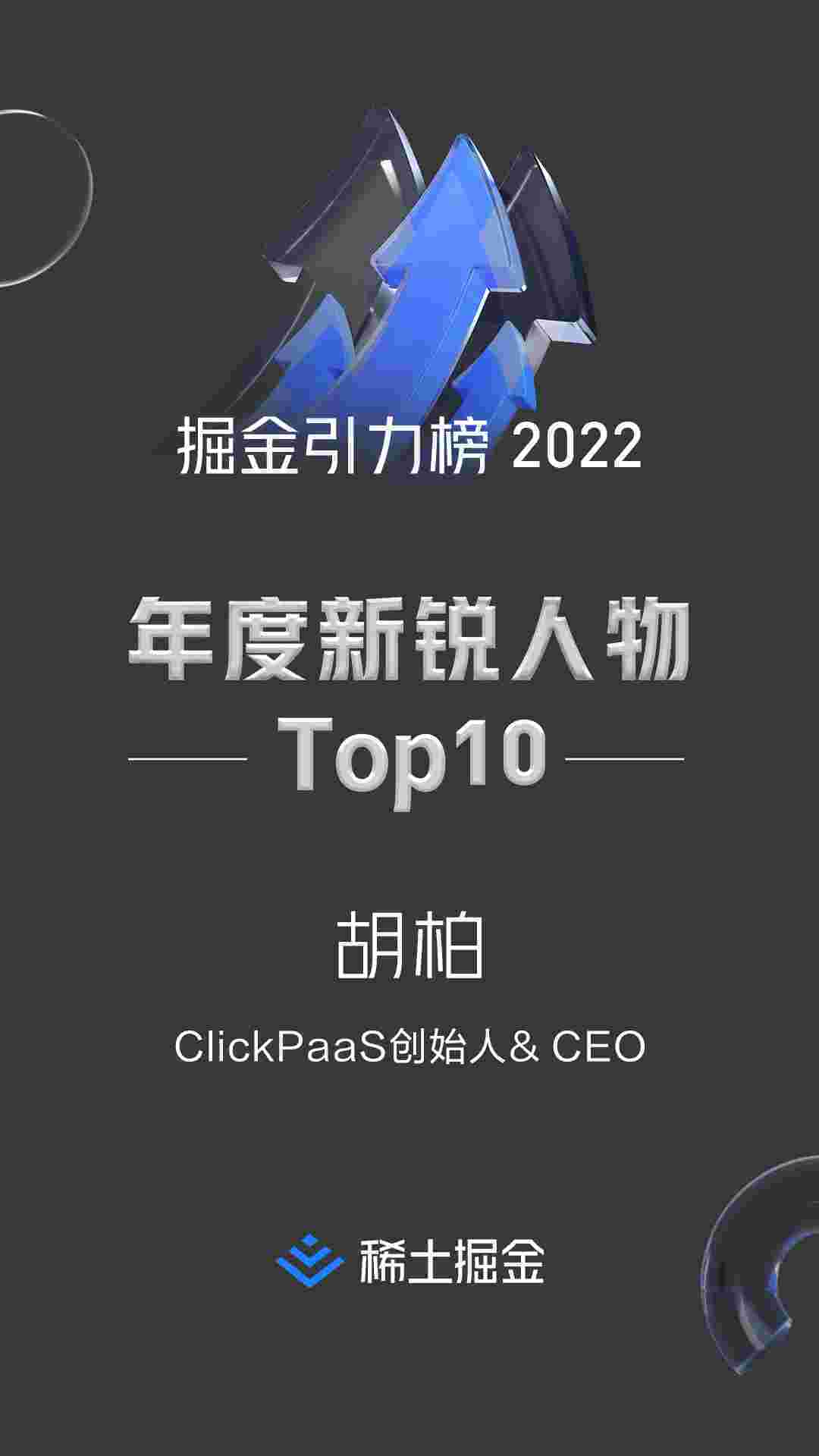 2022年1月6日,,,,,,,,,,,稀土掘金社区第一届「掘金未来大会」成功举办,,,,,,,,,,,会上发布了“2022 稀土掘金引力榜 年度新锐人物”榜单,,,,上海爱湃斯科技有限公司(简称抖音钱包)创始人及CEO胡柏实力入选年度新锐人物TOP 10。。。。。。。。。。。。